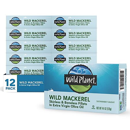 Wild Planet Wild Mackerel Fillets in Organic Extra Virgin Olive Oil, Skinless & Boneless, Tinned Fish, 4.4 Ounce ( Pack of 12)~$29.76 @ Amazon