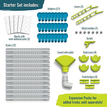 • What's Included: The Starter Set comes with over 60 pieces, including 12 tracks, 7 marbles, 40 nano-adhesive pads, levers, a funnel, and more.