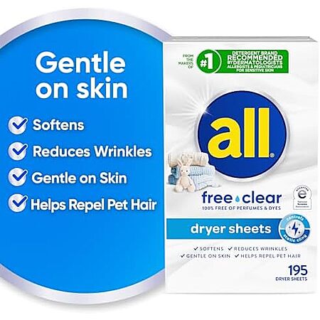 [S&S, AC] $6.07* | 195-Count all Free Clear Fabric Softener Dryer Sheets for Sensitive Skin at Amazon