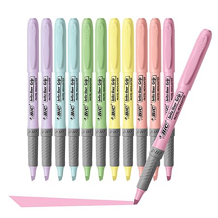 Model: BIC Brite Liner Grip Pastel Highlighter Set, Chisel Tip, 12-Count Pack of Assorted Colors, Cute Highlighters for Bullet Journal Exercises, Note Taking and More