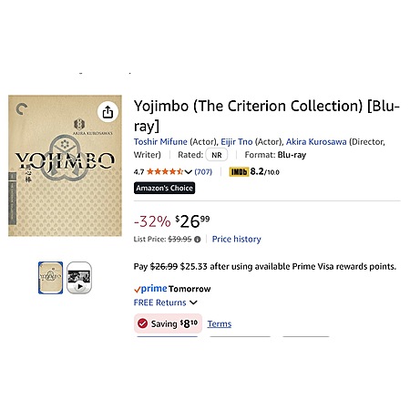 Yojimbo (The Criterion Collection) [Blu-ray] $18.89 with Coupon YMMV Maybe region specific Amazon.com