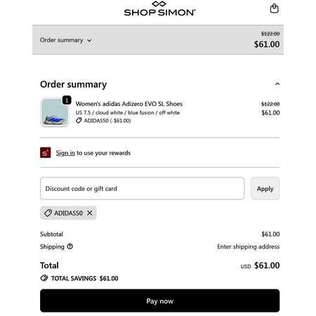Shop Simon has Adidas adizero EVO SL high performance running shoes for $61