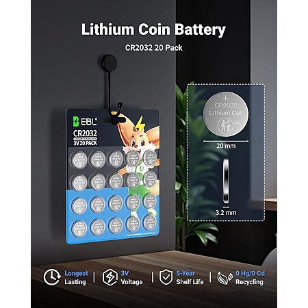EBL-Stores via Amazon [amazon.com] has 20-Pack EBL CR2032 Batteries 3V Coin Battery on sale for $5.98. Shipping is free w/ Prime or on orders $35+.