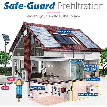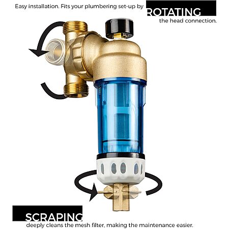 About this item- Press Gauge design. The whole house spin down sediment water filter has high impact stainless steel mesh filter screen rated at 50 Micron. Double threads on both ends: 1 inch MNPT and 3/4 inch FNPT, 1/4" flush out fitting included