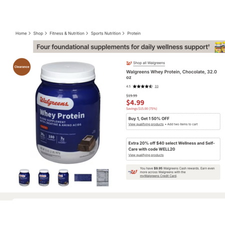 Walgreens Whey Protein Powder, Chocolate flavor w/ Creatine & Amino Acids $4.99 (YMMV)