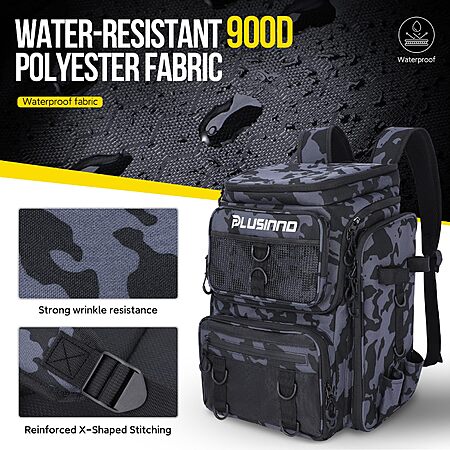 Plus innovations via Amazon.com has PLUSINNO Fishing Backpack with Rod Holders, 42L Large Water-Resistant Tackle Bag for Fishing, Camping, Hiking, Gifts, Black Camouflage., 36 cm x 25 cm x 45 cm, Daypack on sale for $34. Save 8% at checkout.