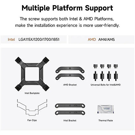 Supports Intel LGA1851/1700/1200/115X and AMD AM5/AM4 sockets for broad compatibility.