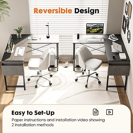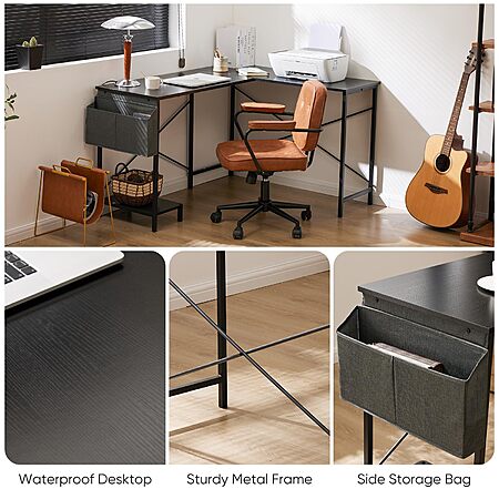 Model: Sweetcrispy L Shaped Computer Desk - Gaming Table Corner Desk 50 Inch PC Writing Black Desk Study Desks with Wooden Desktop CPU Stand Side Bag Reversible for Home Office Dorm Small Space