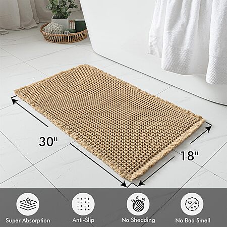 UPGRADED WAFFLE DESGIN: 18 x 30 Inch. Including 2 brown waffle bath mats. These boho bath mats are woven with upgraded yarns. The heavier and thicker threads are applied to ensure the pattern will be more solid and compact. It is not only decorative but also durable and NEVER OUT OF SHAPE. Note: Length and width of these bath rugs include tassel part.