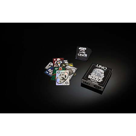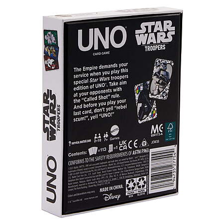 Fans of Star Wars will love playing this Troopers themed UNO card game. With a deck featuring images of favorite Trooper characters from the Star Wars universe, players try and match colors and numbers -- there's even a special 'Called Shot' rule that will have players taking a 'shot' at guessing the cards in another player's hand! Each deck also includes one foil card. And when down to a last card, don't forget to yell 'UNO!' Makes a great gift for fans of Star Wars Trooper characters and card game lovers ages 7 years old and up. Colors and decorations may vary. The UNO game players love features images of all kinds of Troopers from the Star Wars universe. Gameplay matches the classic card game where players match colors and numbers to get rid of all their cards. The special 'Called Shot' card will have players trying to guess the color of a card in another player's hand. Guess right and it's a hit and they must draw cards; guess wrong and it's a miss. Comes with a special, foil version of the Wild 'Called Shot' Card, which can be saved or used in the game! The game is part of the UNO Fandom series, exclusive decks that are produced in small quantities and not offered anywhere else. Designed for 2 to 10 players ages 7 years and older, the collectible card game makes a great gift for fans of Star Wars and all Troopers from the Star Wars universe!