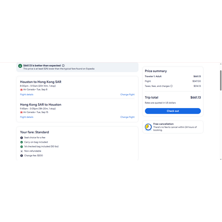 Air Canada and Expedia have round trip airfares travelling from Houston TX (IAH) to Hong Kong (HKG) for $662, making 1 stop. These are economy basic fares that only allow a personal item, a carry-on bag and 1 free checked bag.