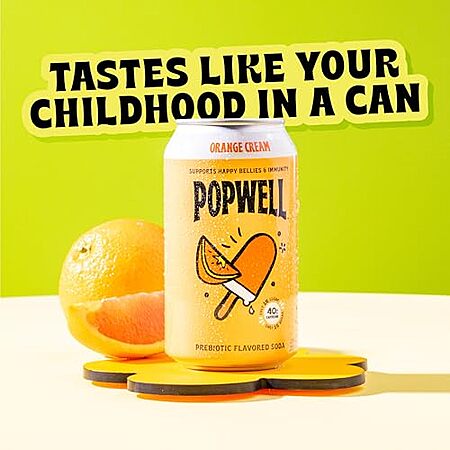Model: Popwell Orange Cream Caffeinated Better-For-You Prebiotic Soda, with 6g Fiber, 1g Sugar, Vitamins and Immunity Support, 12 fl oz Cans (pack of 12)
