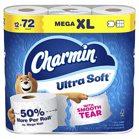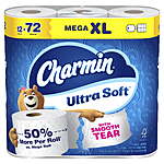 Charmin Toilet Paper Ultra Soft, 12 Mega XL Rolls, 2-Ply Bath Tissue =72 Reg Rolls $17.96 FS WALMART+ at $35
