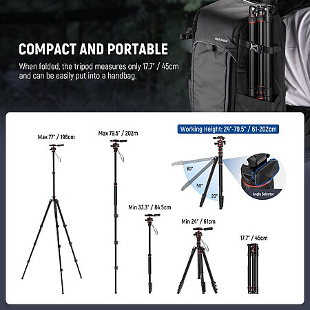 Model: NEEWER Basics Camera Tripod Monopod, 77" Compact Lightweight Travel DSLR Video Stand, 360° Ball Head, Arca Type QR Plate, Reversible Legs & Inverted Central Axis, 13lb Max Load, TP08