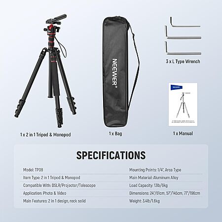 ShiQiaoShang via Amazon has 77" NEEWER Basics 2-in-1 Camera Tripod & Monopod w/ 360° Ball Head & Arca Plate on sale for $32.39. Clip coupon to get this price.