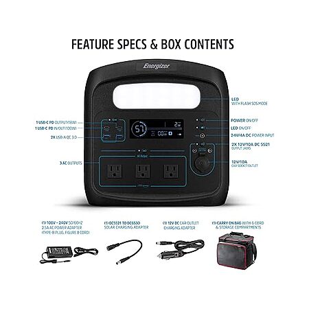 (1) DC5521 to DC6530 Extension Adapter, (1) Carrying Case w/ Shoulder Strap & 6 Sortage Compartments, (1) 120V AC Adapter, (1) Energizer 960W LiFePO4 (LFP) Portable Power Station (V2), (1) 12V Car Outlet Charging Adapter, (1) User Manual