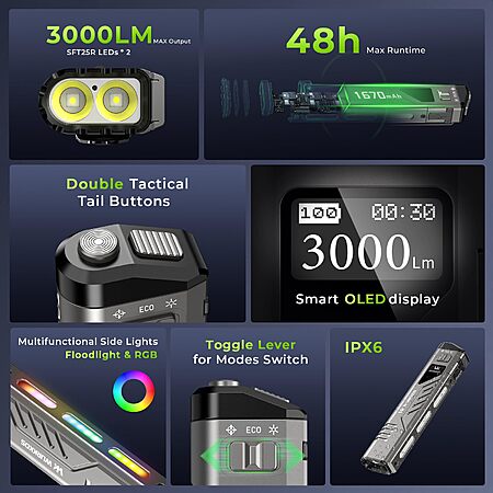 Model: Wurkkos TD11 Tactical EDC Flashlight, 3000 Lumen Slim Flat Flashlight, USB-C Rechargeable Flashlight with OLED Display, Dual Tactical Buttons, Spotlight/Floodlight/RGB, IPX6 for Camping & Emergencies