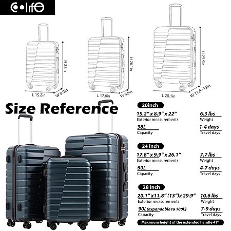 - Three different size: Size: 20inch (22 x 8.9 x 15.2), 24inch (17.8 x 9.9 x 26.1) 28inch (20.1 x 11.8(13in when it is explandable)x 29.9).20inch and 24inch luggage is perfect for business and personal travel, 28in is expandable add 15% to the scalable space.