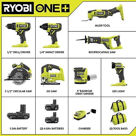 RYOBI ONE+ 18V Cordless 8-Tool Combo Kit with (1) 1.5 Ah Battery and (2) 4.0 Ah Batteries and Charger $349