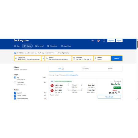 Turkish Airlines via Booking.com have round trip airfares travelling from New Jersey (EWR) to Cairo Egypt (CAI) for $634, making 1 stop in Istanbul Turkey for 9-12 hours, depending on the flight you choose. These are economy fares that allow a personal item, a carry-on bag and 2 free checked bags.