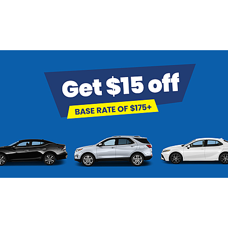 $15 off a minimum 1-day, maximum 27-day rental in which the base rate charge (exclusive of applicable taxes (including GST), fees, surcharges, refueling, drop-off, delivery, youthful driver, additional driver, pickup, or any optional product or service (such as optional damage waiver of $50 or less per day) of at least $175. Offer valid for vehicles reserved in advance for travel from 01/05/2026 through 02/21/2026 at participating locations in the U.S. Vehicle must be picked up by 02/07/2026 and returned by 02/21/2026. Offer not available on Exotic, Cargo Van, Box Truck, and Stake Bed vehicle classes. Additional mandatory charges may be imposed, including, but not limited to a customer facility charge, airport concession fee, tourism commission assessment, vehicle license recovery fee, or other government-imposed taxes or fees. Offer does not apply to refueling, drop-off, delivery, youthful driver, additional driver, pick up, or one way charges or any optional product or service (such as optional damage waiver of $50 or less per day), which are the responsibility of the Renter.