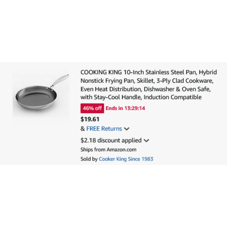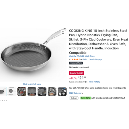 COOKING KING 10" Stainless Steel Hybrid Nonstick Pan, 3-Ply Clad, Dishwasher & Oven Safe, w/Stay-Cool Handle. YMMV - Brand Promo Price $19.61