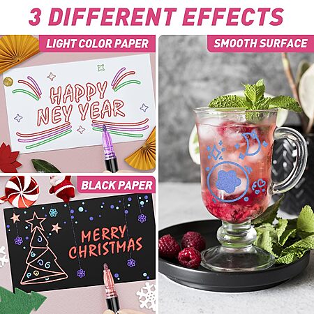 • ✨ 【Triple-Tone Magic with Strong Glitter Effect】Unleash triple creative effects with our innovative dual-tip technology! On light paper: metallic silver + vibrant color lines. On dark surfaces: stunning standalone silver. On glossy materials: pure vivid shimmering colors. With a strong glitter finish and smooth-flowing 2-3mm medium tip, these pens make every project shine—perfect for scrapbooking, cards, and crafts