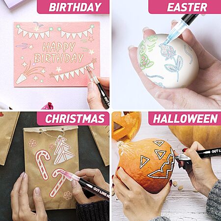 • 🎨 【Widely Used on Various Surfaces】Take creativity beyond paper! GLOPUS outline pens work on almost any surface—wood, glass, ceramic, stone, metal, plastic, whiteboard, and more. Great for Easter eggs, photo albums, guest books, holiday cards, DIY decorations, and school projects. Add sparkling magic to anything you imagine