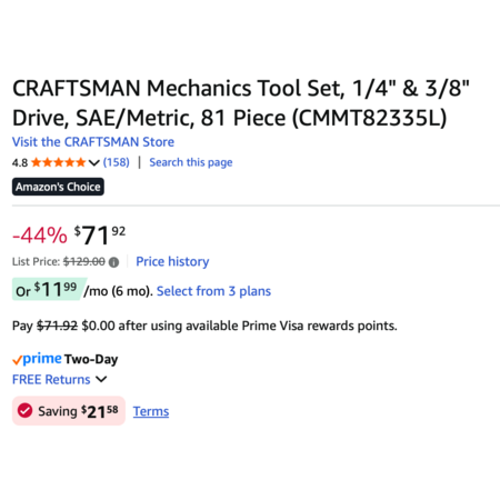Amazon [amazon.com] has 81-Piece CRAFTSMAN Mechanics Tool Set, 1/4" & 3/8" Drive, SAE/Metric (CMMT82335L) for $50.34 after you clip the $21.58 coupon (see attachment).