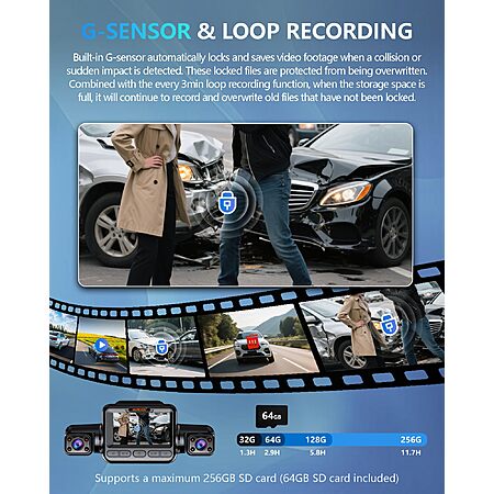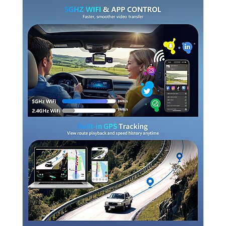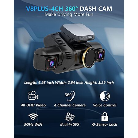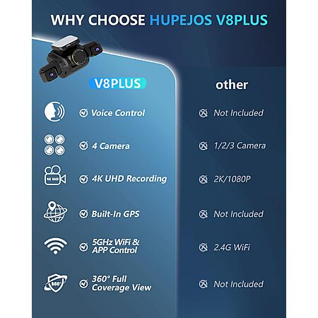 Hupejos V8 Plus Dash Cam 4 Channel Front and Rear Inside, 360° Car Camera 4K, Wi-Fi GPS, 64GB Card, Voice Control, CPL Filter, WDR Night Vision, 24H opt. Parking Mode $119.99