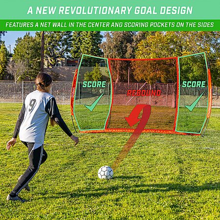 - NEW SOCCER TRAINING GOAL: Innovative soccer net with a center net wall and scoring pockets on the sides; Improve shot accuracy by directing players to aim for the corners where they are more likely to score; Measures 12 ft x 8 ft; Patent pending