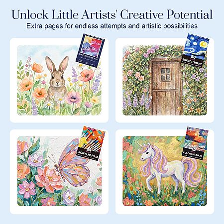 • All-In-One Package: Includes 60 crayons, 24 colored pencils, 24 oil pastels, 24 watercolor cakes, 24 acrylic paints, brushes, palettes, canvases, and various sketching tools—everything you need to start creating.