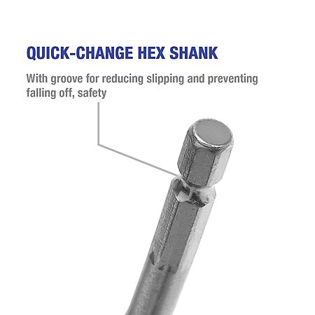 - Quick-Change Hex Shank, with groove for reducing slipping and preventing falling off, safety