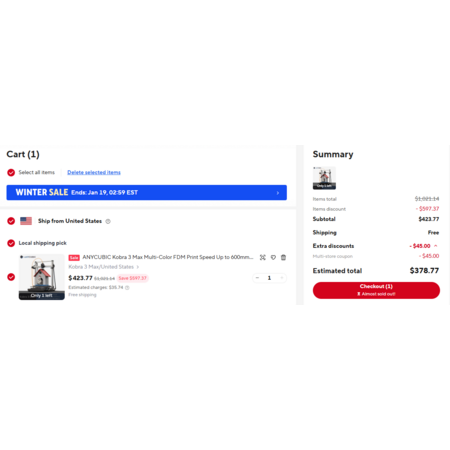AliExpress $378.77 Kobra 3 Max printer only after $45 off coupon 45USAFF