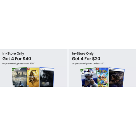 GameStop: In-Store - Pre-owned games 4/$20 (Valued $10 or less) and 4/$40 (Valued $20 or less)
