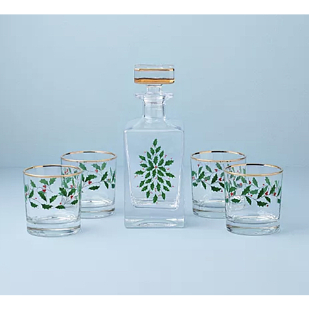 Toast to festive fun with this set from Lenox. Part of the iconic Holiday Collection, it includes four double old fashioned glasses and a matching decanter.