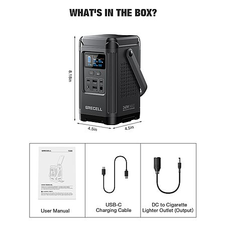 • WHAT YOU GET -1* GRECELL 240W Power Station, 1 * USB-C Charging Cable, 1 * DC to Cigarette Lighter Outlet (Output), 1 * User Manual. (Note: Wall charger not included)