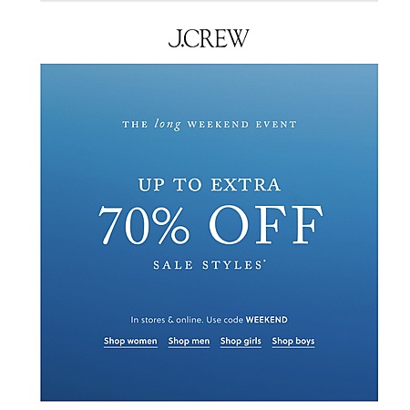 J Crew ( Not Factory ) Extra 50% Off 1-2 Sale Styles or 70% Off 3+ Sale Styles with Code WEEKEND