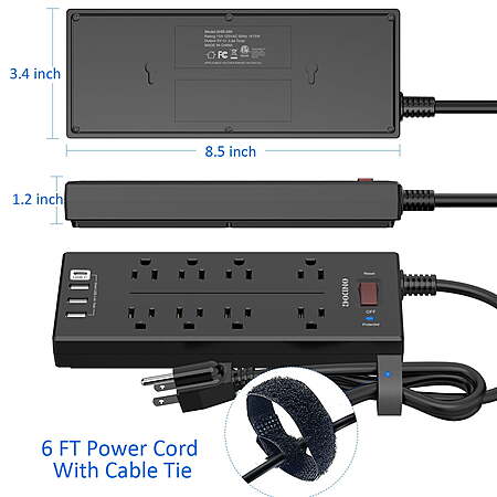 Model: Surge Protector - 8 AC Outlets and 4 USB Ports (1 USB-C), 6ft Extension Cord Power Strip for Home, Office, Black
