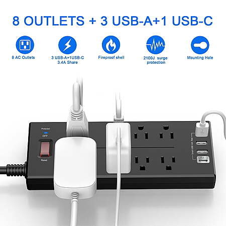 • Multi-Plug Power Strip: The surge protector power strip features 8 AC outlets and 4 USB ports (1 USB-C) 5V/3A, delivering a total output of 17W/3.4A to power multiple devices simultaneously.