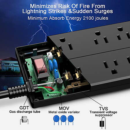 • Multiple Safety Protections: The surge protector power strip features a built-in 2100-joule surge protection system and provides over-voltage, over-current, overload, and short-circuit protection to ensure safe and reliable power usage.