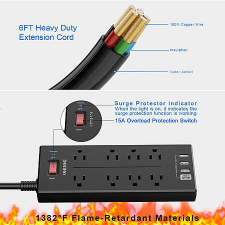 • Power Strip with USB: The USB charging ports deliver a total output of 3.4A/17W. Each USB-A port provides up to 2.4A, while the USB-C port supports up to 5V/3A. The 6-foot extension cord allows you to power up to 12 devices simultaneously.