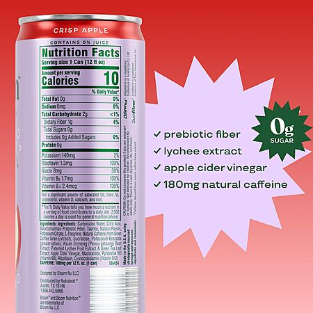 Bloom Nutrition Sparkling Energy Drink (Crisp Apple, Zero Sugar, 180mg Caffeine) – 12 Pack – $19.98