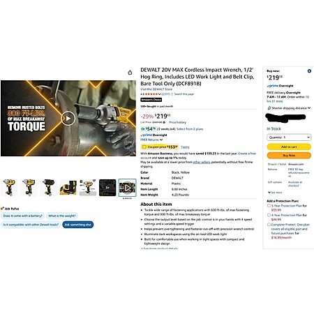 DEWALT 20V MAX Cordless Impact Wrench, 1/2' Hog Ring, Includes LED Work Light and Belt Clip, Bare Tool Only (DCF891B) $153.32 YMMV Amazon