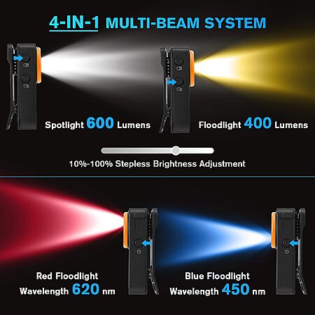 • 600 lumen spotlight, 400 lumen floodlight, 620nm red light, 450 nm blue light