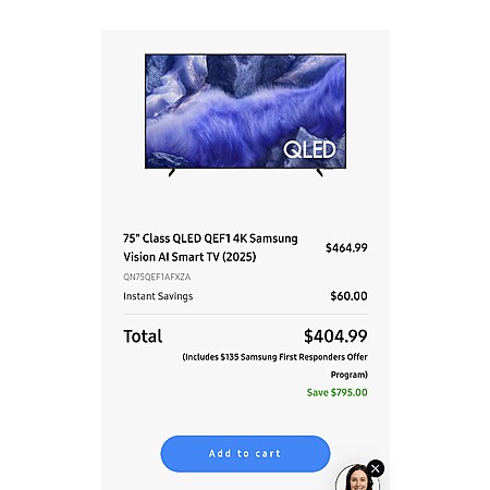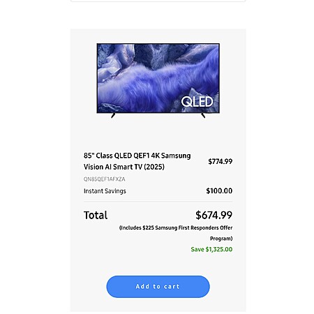 Samsung.com has the 75" QLED QEF1 model on sale for those with an EPP account, (mine is a first responder account). Start by logging into your account. Then you can save an additional 10% by watching this video advertisement. https://www.samsung.com/us/tvs/vision-ai-tv/