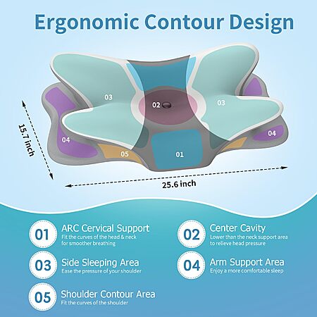 Product Description from Amazon:- [REVOLUTIONIZE YOUR SLEEP WITH A GOOD PILLOW] The ergonomically designed memory foam pillows support your head, neck, shoulders and back perfectly. Besyodo ergonomic pillow adopts a unique butterfly shape design and hollow centre design. The center cavity design properly cradles your head, naturally fit your neck's curve and aligning your spine, allowing the entire body spine to be more efficiently supported, stretched and relaxed. With an extended armrest area, you can position your arms freely.