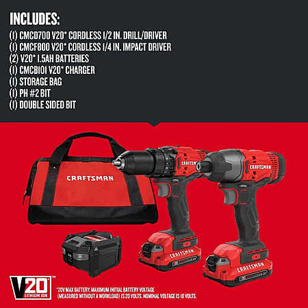 CRAFTSMAN V20* Cordless Drill and Impact Driver Combo 2 Battery Kit Item No. SKU# CMCK200C2 $87