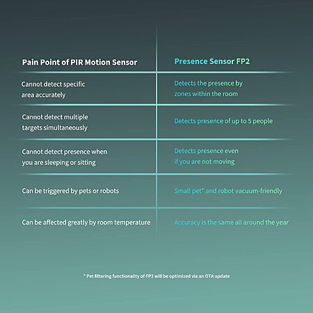 2.4 GHz Wi-Fi Required- [šššÆšš§ššš šš®š„šš¢-ššØš§š ššššššš¢šØš§] The Aqara Presence Sensor FP2 (2.4GHz Wi-Fi only) outperforms traditional PIR motion sensors by using a single radar sensor to monitor areas up to 40ć” (430 sq ft). Create up to 30 zones (e.g., sofa, bed, desk) and assign custom automations to each. It combines the functions of multiple PIR sensors in one. Note: Use a 5Vā1A power adapter (not included) and keep the product continuously powered during use.