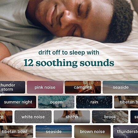 - 12 Soothing Sounds: White Noise, Brown Noise, Pink Noise, Thunderstorm, Rain, Campfire, Shhhh, Tibetan Bowl, Brook, Ocean, Summer Night, and Seaside